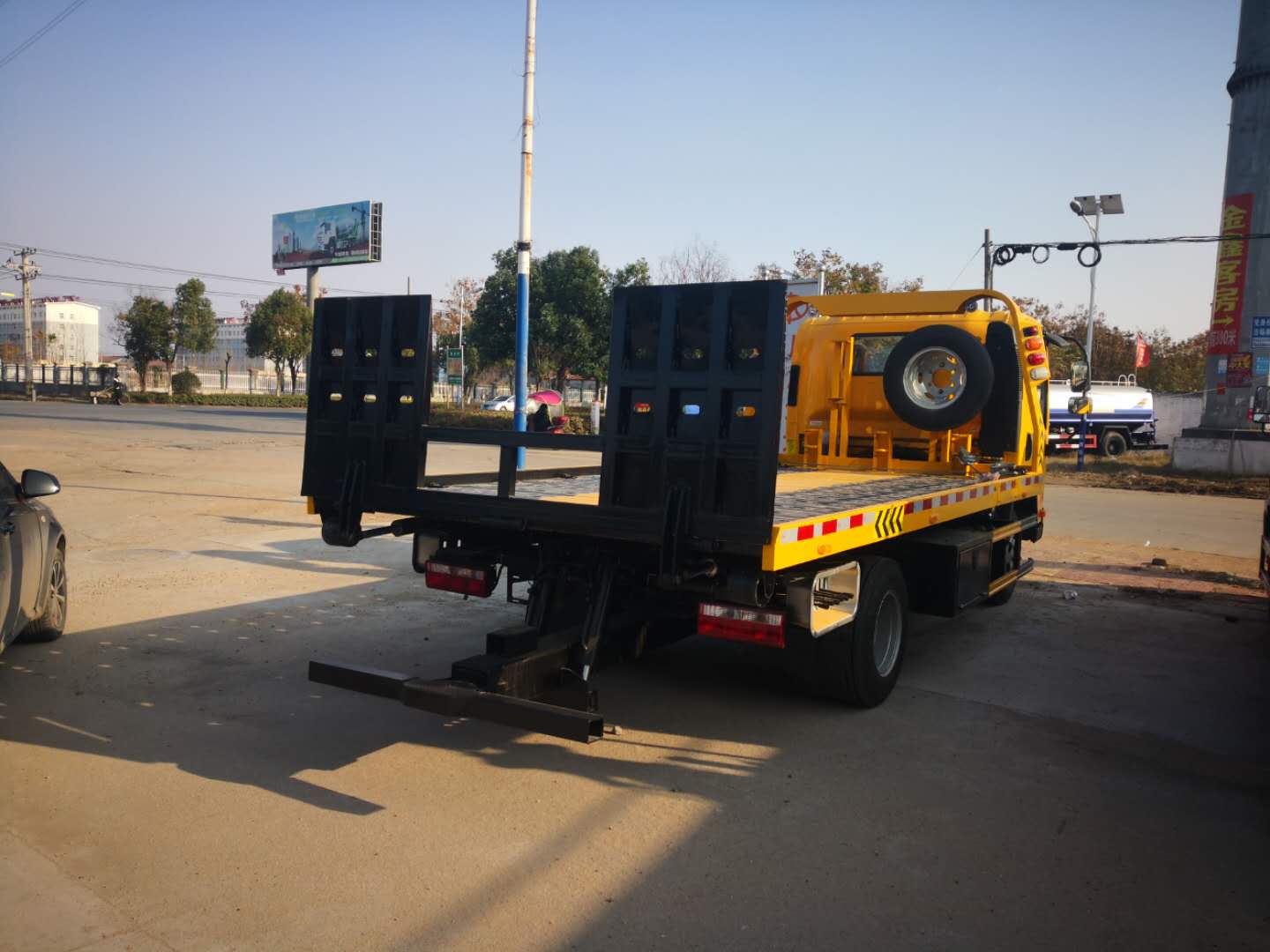 上裝配置:采用德國技術(shù)折疊沖壓式平板,平板長4.2米,寬2.3米,雙側(cè)聯(lián)動操作裝置,配后工作燈2只,一個(gè)4噸液壓絞盤,帶21米鋼絲繩,一個(gè)工具箱,一個(gè)洗手箱,配2個(gè)小車,4根捆綁帶,L型抱胎架一對,加液壓伸縮式**板(1.1米),注:藍(lán)牌一拖二清障分為尾部翻轉(zhuǎn)和尾部伸縮兩種,尾部翻轉(zhuǎn)板可根據(jù)客戶要求定做中間加長板(加長0.5米,整板長達(dá)到4.7米(不包含尾部翻轉(zhuǎn)1米))