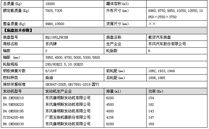 采用東風公司原裝底盤,玉柴200馬力/康明斯210發動機,4500mm軸距,東風6檔變速箱,2315駕駛室,3.9T前橋,8T后橋,295/80R22.5真空胎,250大梁,斷氣剎,空調,電動門窗,中控鎖。